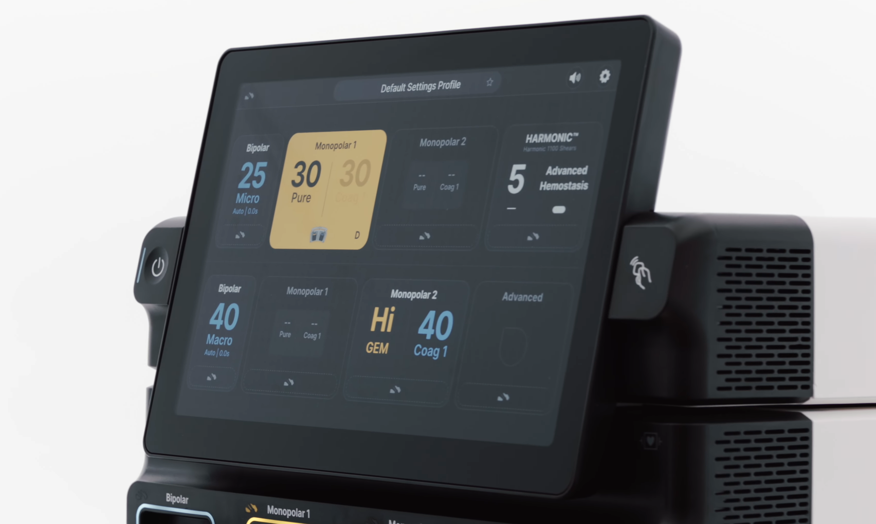 Dark mode distracts less in a darkened OR. Device activation highlights which instrument panel is firing, enforcing a clear hierarchy of active, standby, and unused modes.